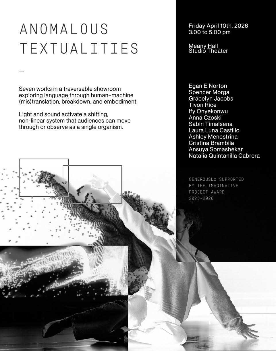 Anomalous Textualities re-imagines the Studio Theater as a traversable showroom. Inhabited by seven distinct works, the margins of language and meaning are re-mediated, embodied, and deconstructed through human-machine (mis)translations. In this performance-installation, spatial, temporal, and linguistic boundaries are blurred, giving way to slippages across models, bodies, and forms. Within this anomalous showroom, language models drive mechanical systems, glitching oracles, and choreographic prompts. Two further works explore non-verbal communication, seeking a physical vocabulary for a world shared with a "technological other."